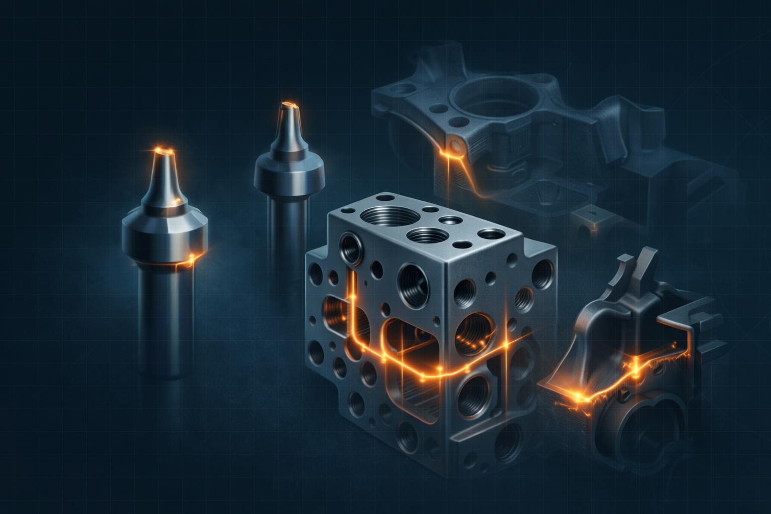 Při výrobě hydraulických bloků, rozdělovačů, těles ventilů a dalších přesných dílů vznikají místa, kde se dva nebo více vrtaných kanálů protínají — tzv. průnik děr (křížení děr). V místě průniku se tvoří otřep uvnitř dílu, kam se klasickým ručním nástrojem nelze dostat.